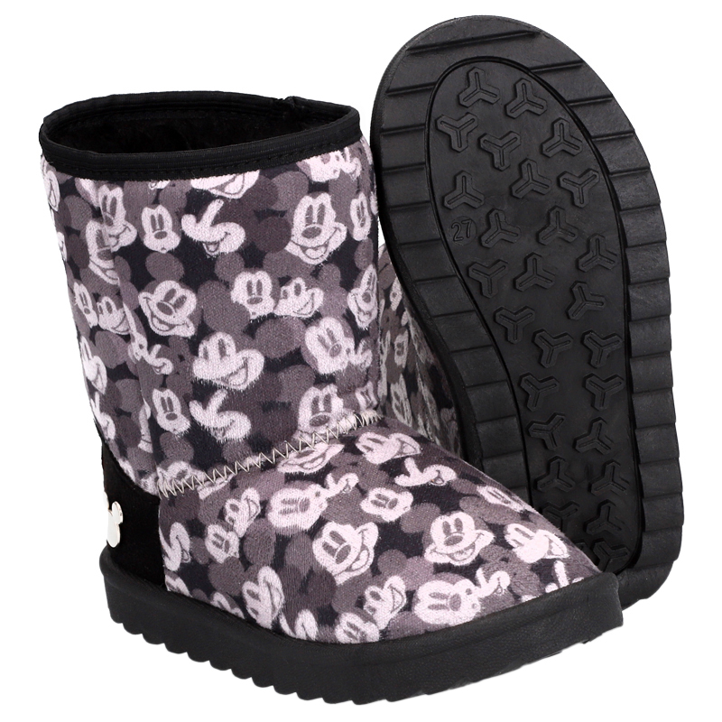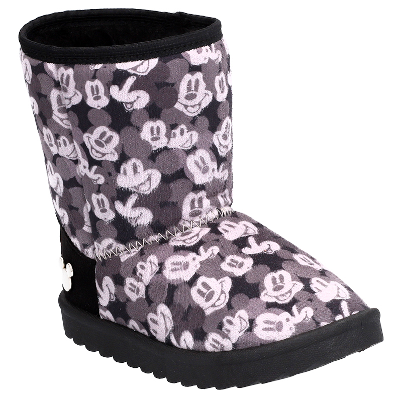 Bota Mickey Mouse textil con cálido forro de piel sintética y detalles decorativos en la parte trasera.