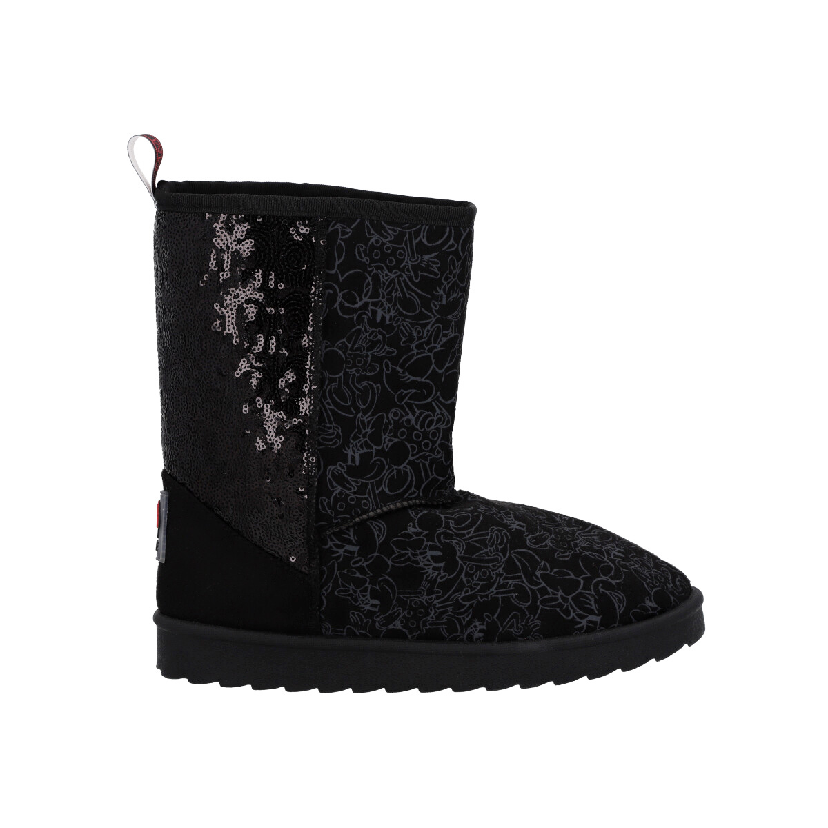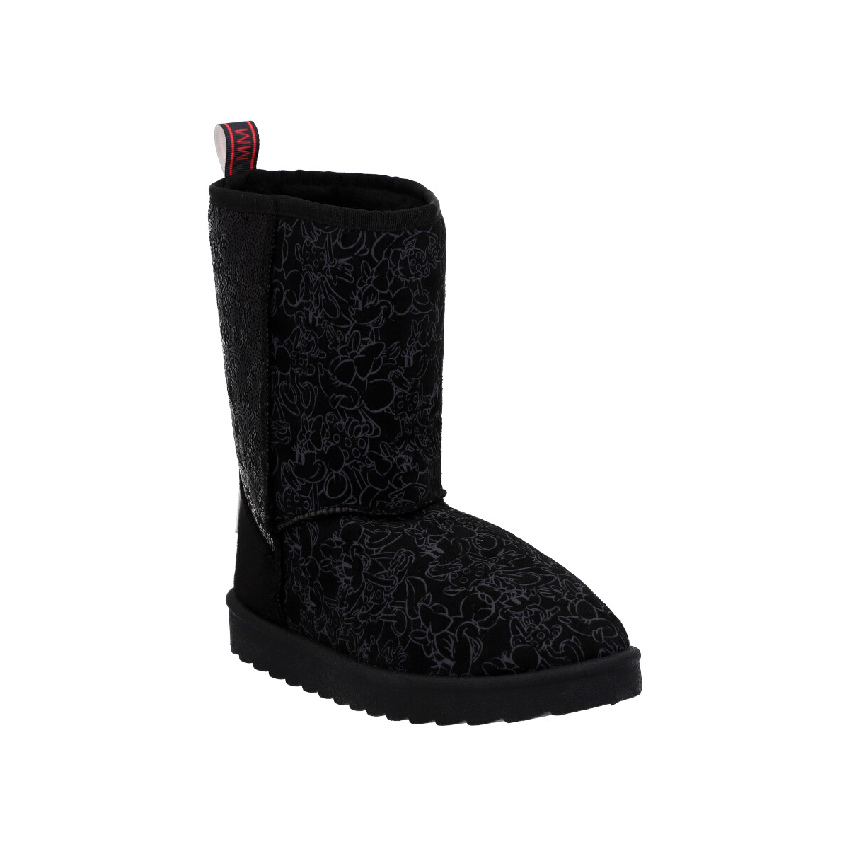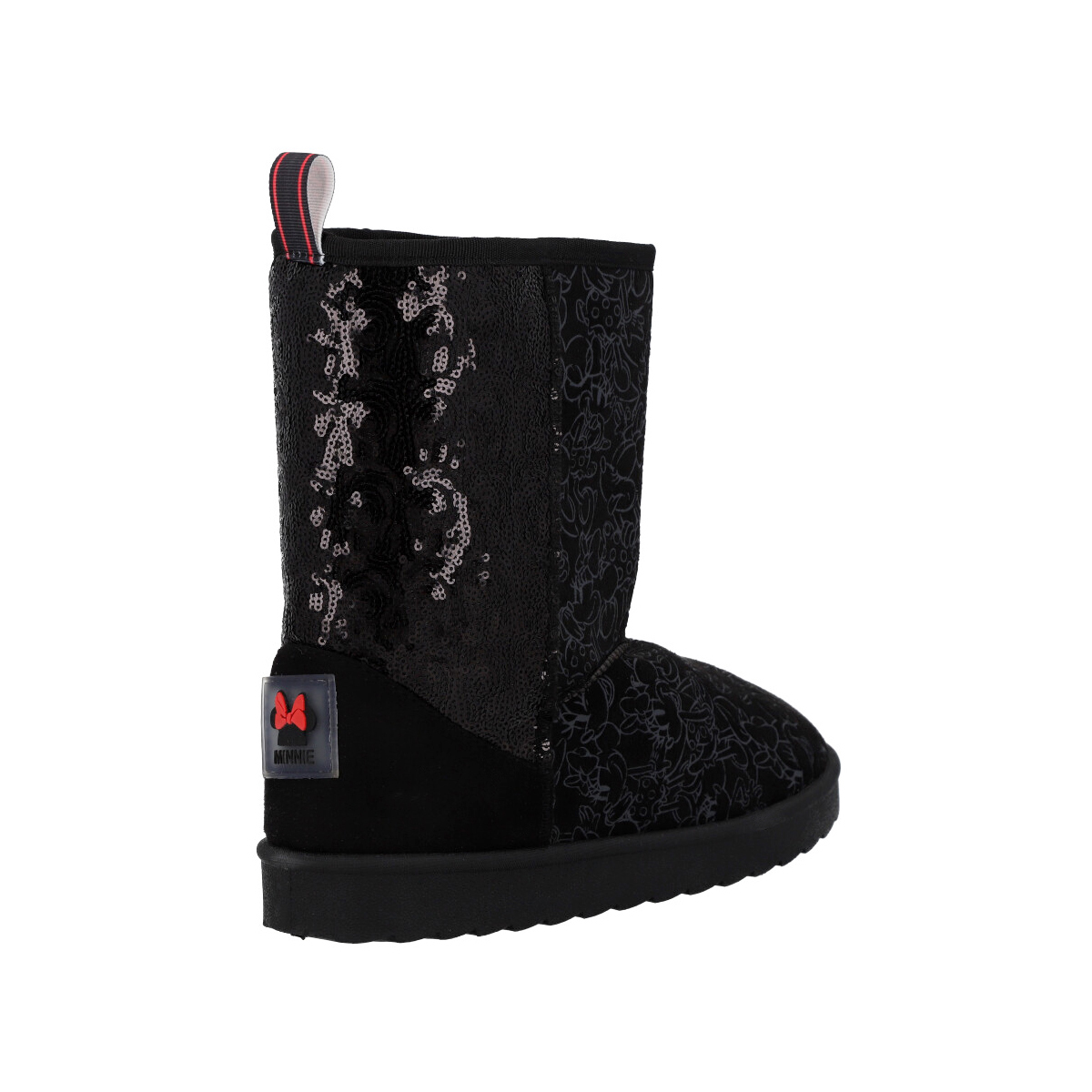 Botas Minnie Mouse textiles con cálido forro de piel sintética, diseño con lentejuelas en la parte trasera y gráficos por toda la capellada.