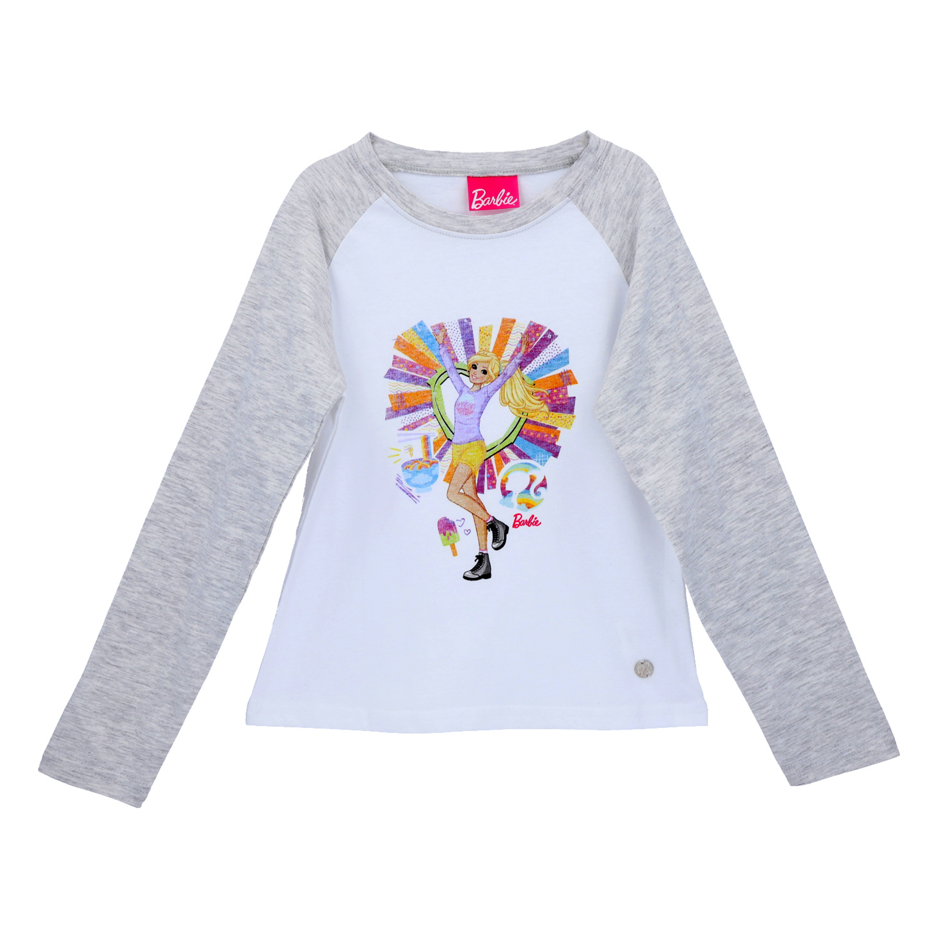 Polera Barbie manga larga bicolor con estampado en el pecho.