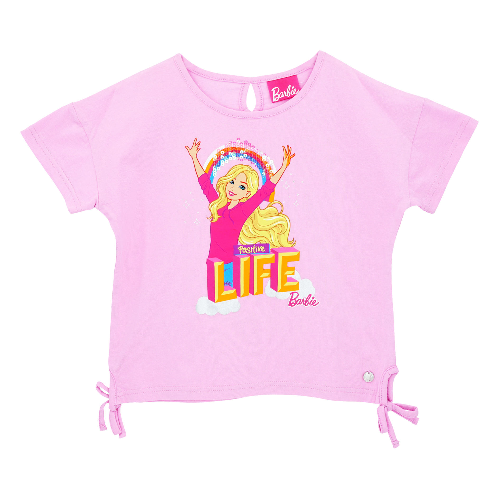 Polera Barbie manga corta con aplicaciones de lentejuelas amarras decorativas en los costados.