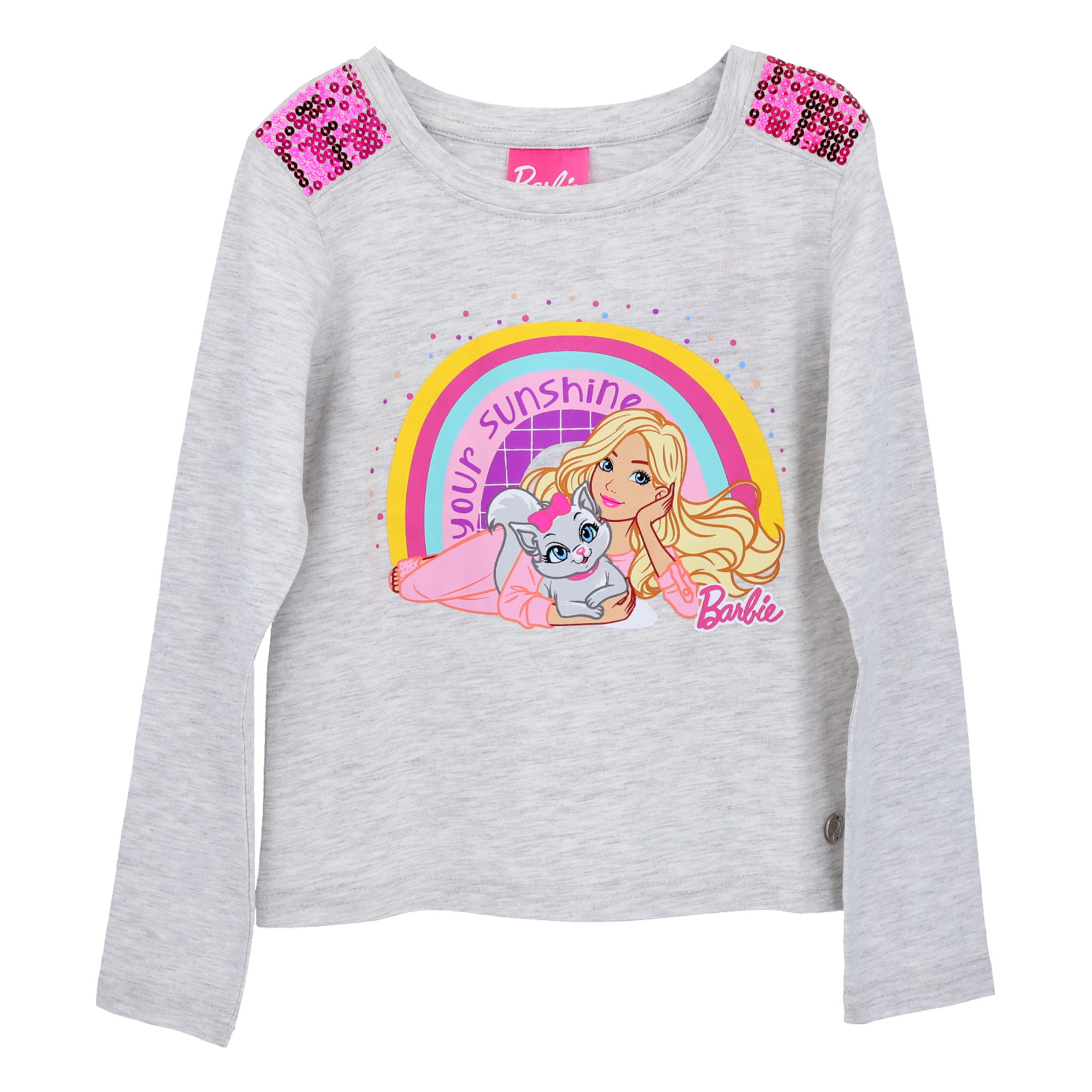 Polera Barbie manga larga con aplicaciones de lentejuelas en los hombros y estampado en el pecho.