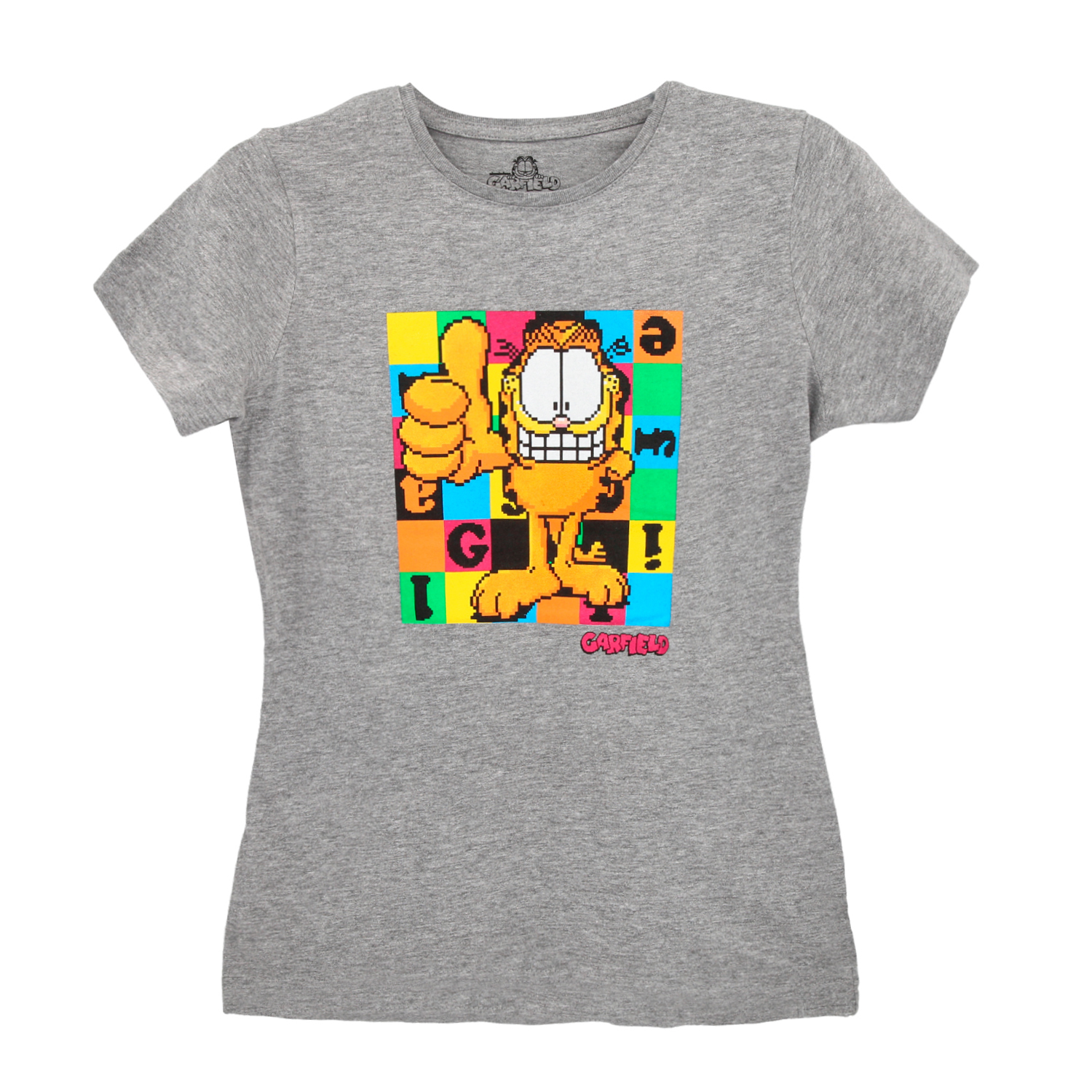 Polera manga corta, con estampado de Garfield. Confeccionada en algodón de producción sostenible.