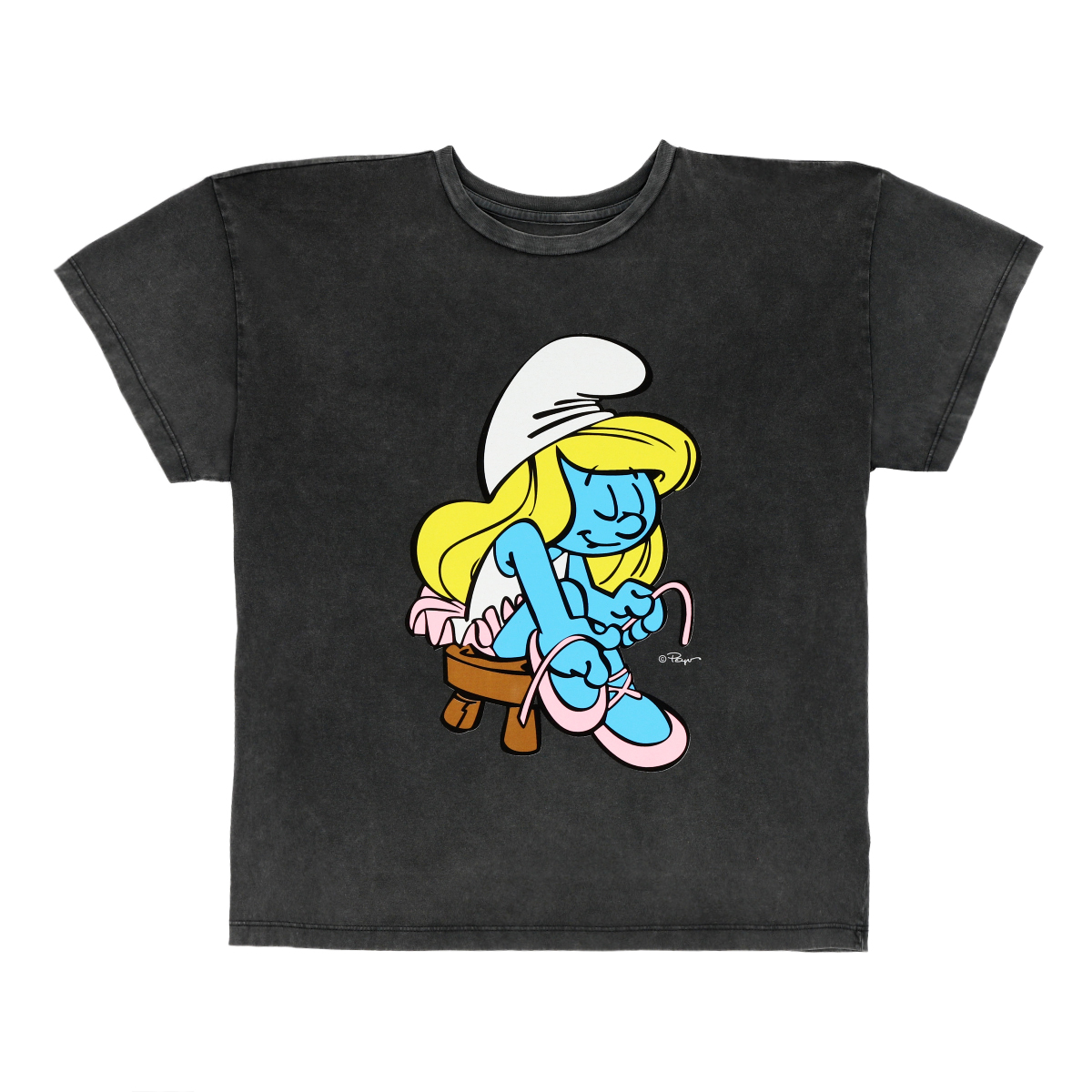 Polera manga corta, con tratamiento de lavado y estampado de Los Pitufos
