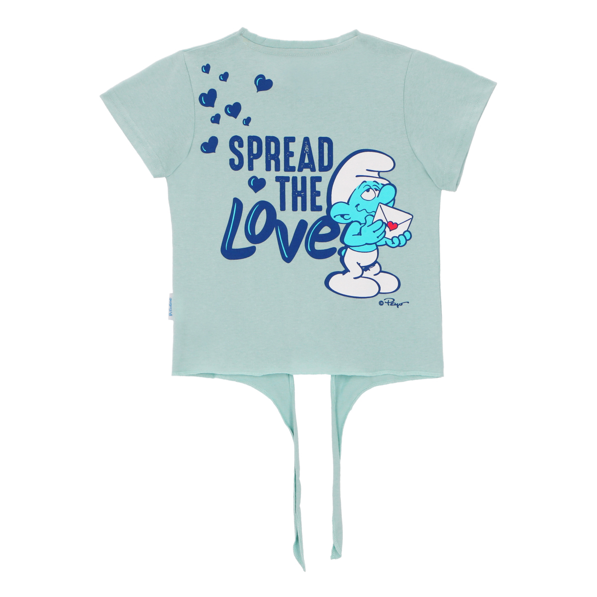 Polera manga corta con estampado de Los Pitufos y amarras en delantero.