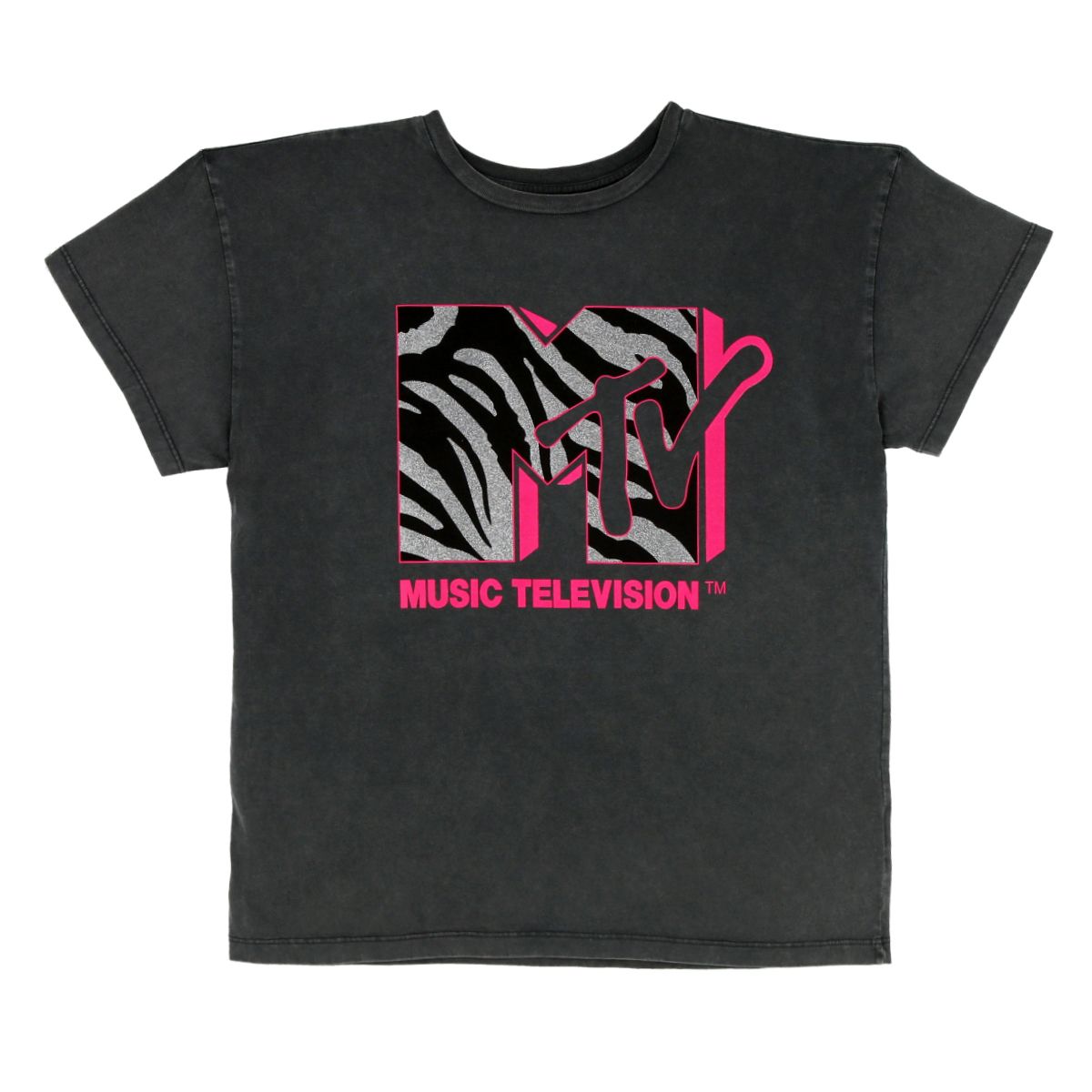 Polera manga corta, con tratamiento de lavado y estampado glitter de MTV animal print.