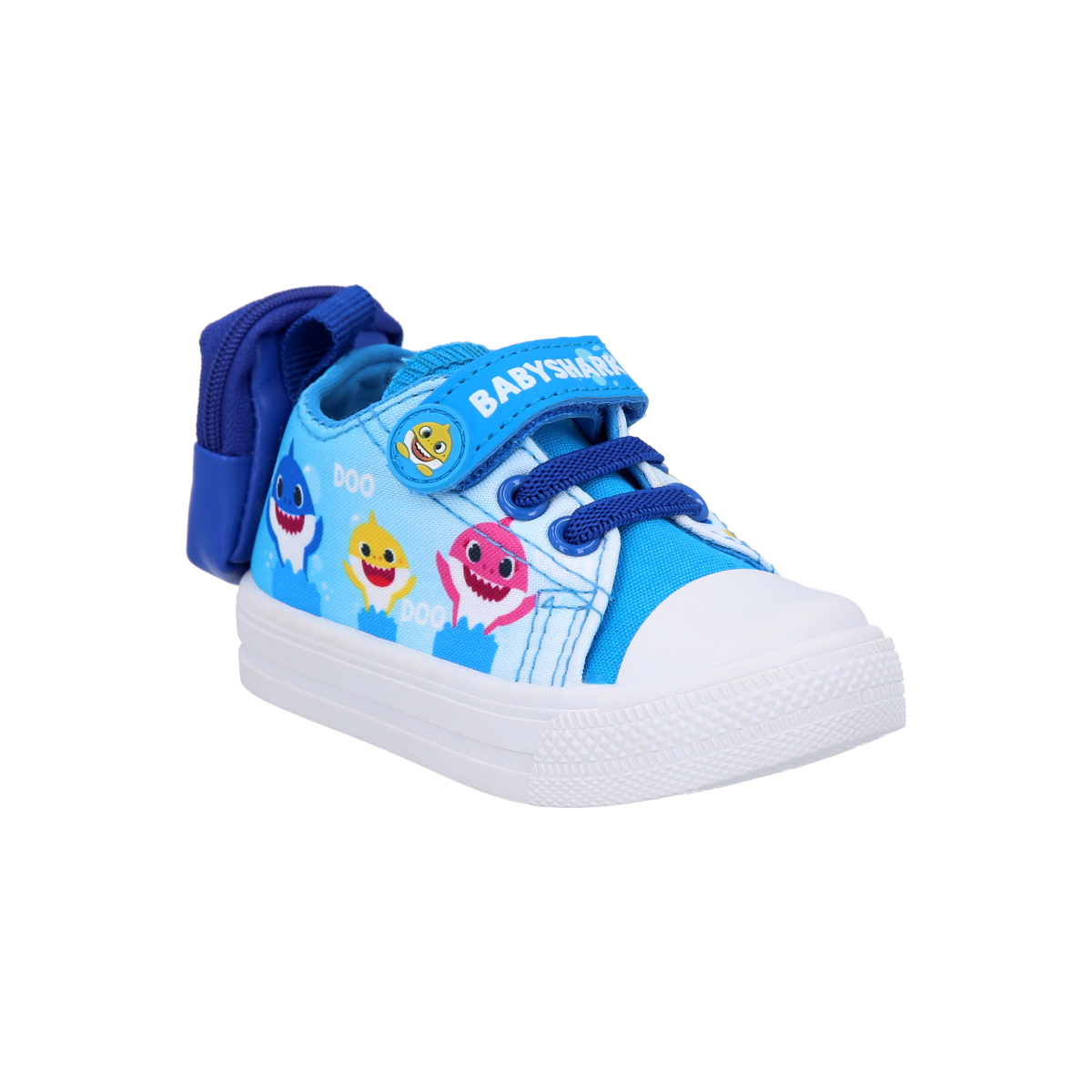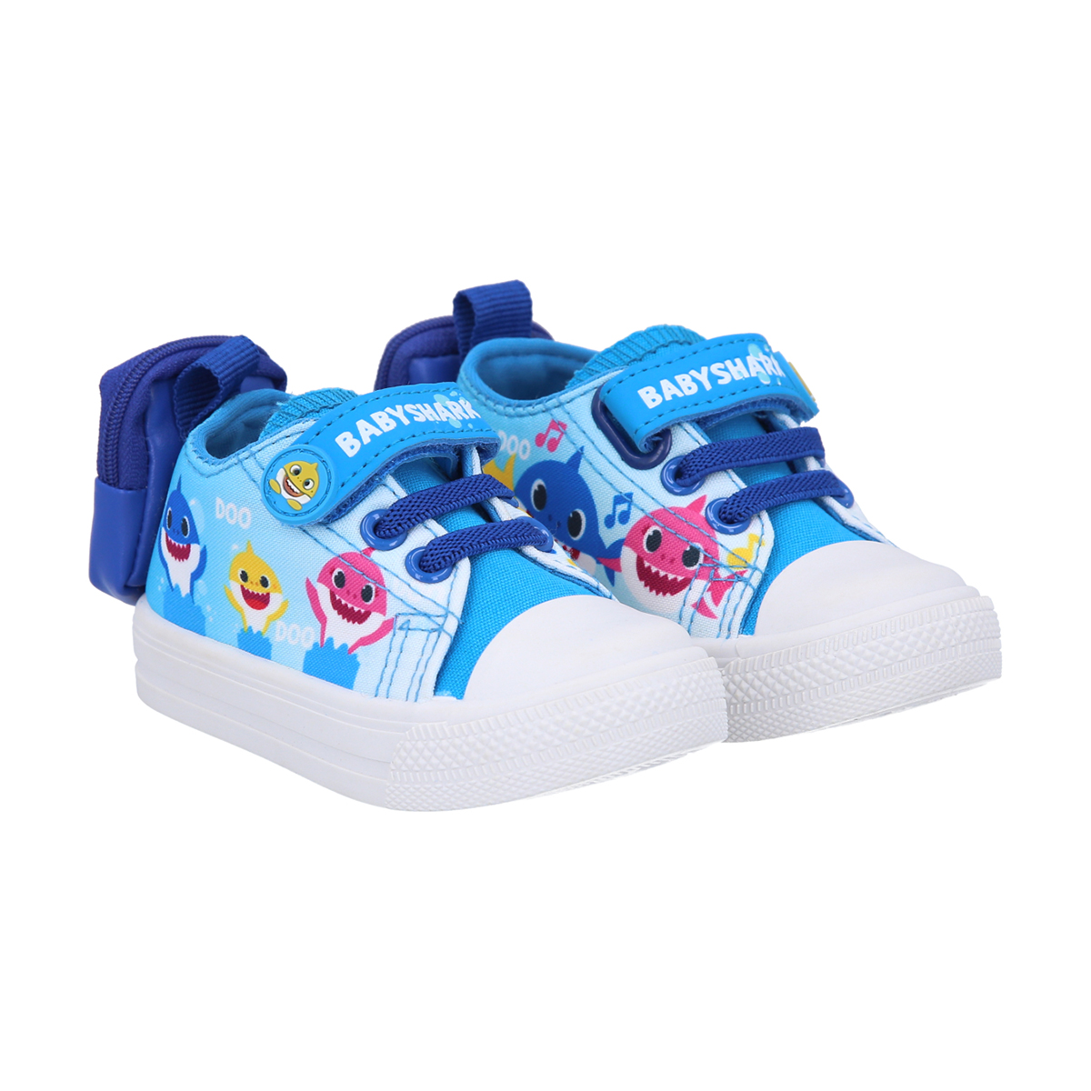 Zapatilla urbana Baby Shark de lona, con estampados, sujeta cordones de velcro y mini bolsillo trasero con cierre.