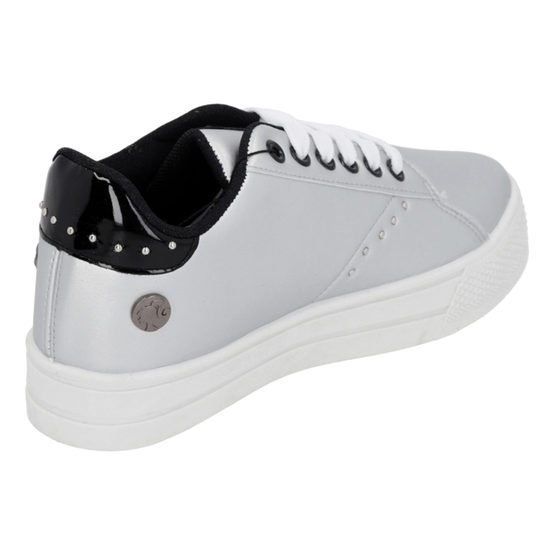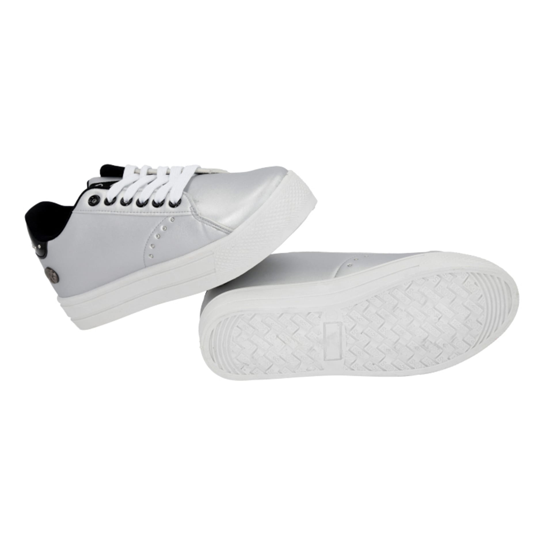Zapatilla urbana Barbie con plataforma. Plateada, con talonera de charol negro y tachas.