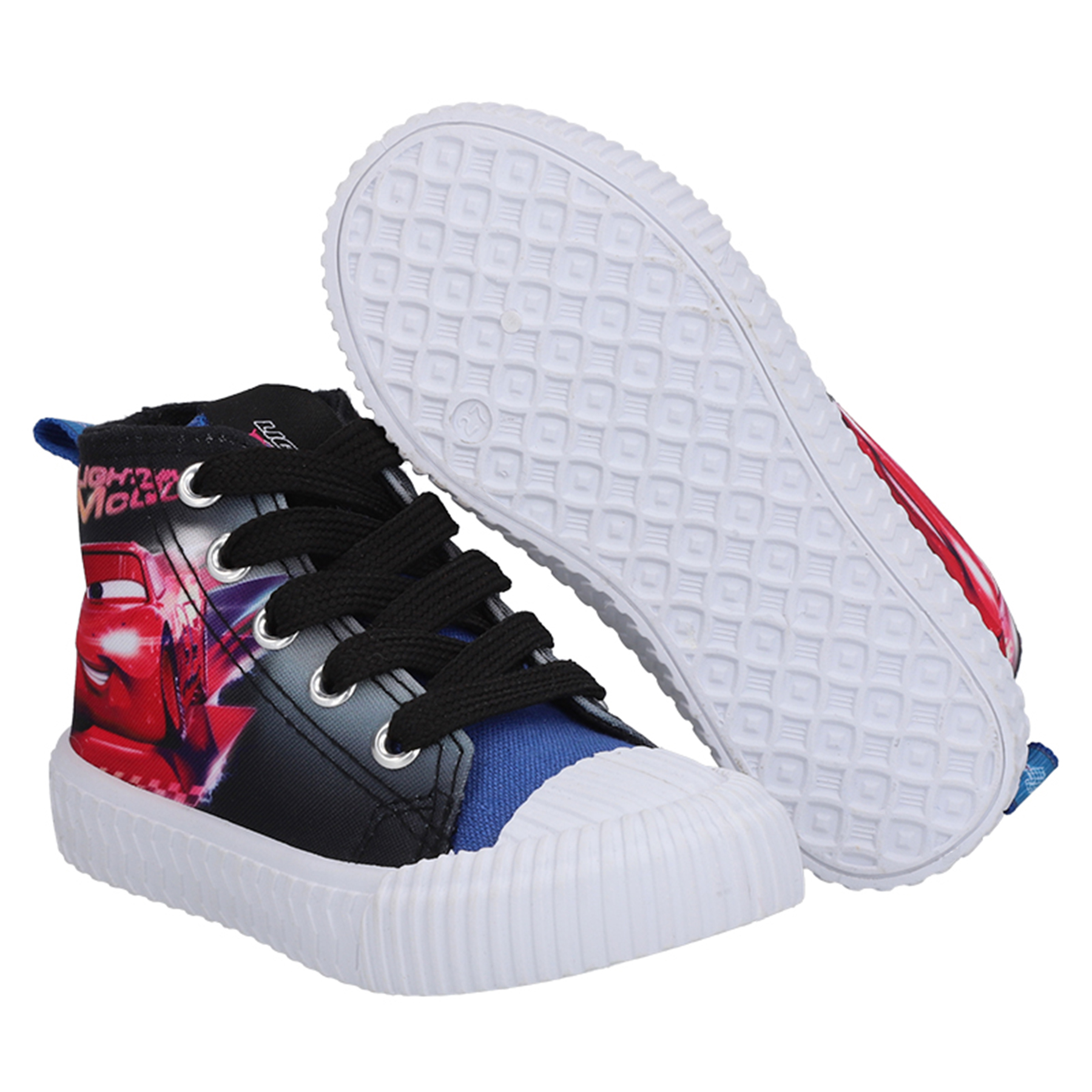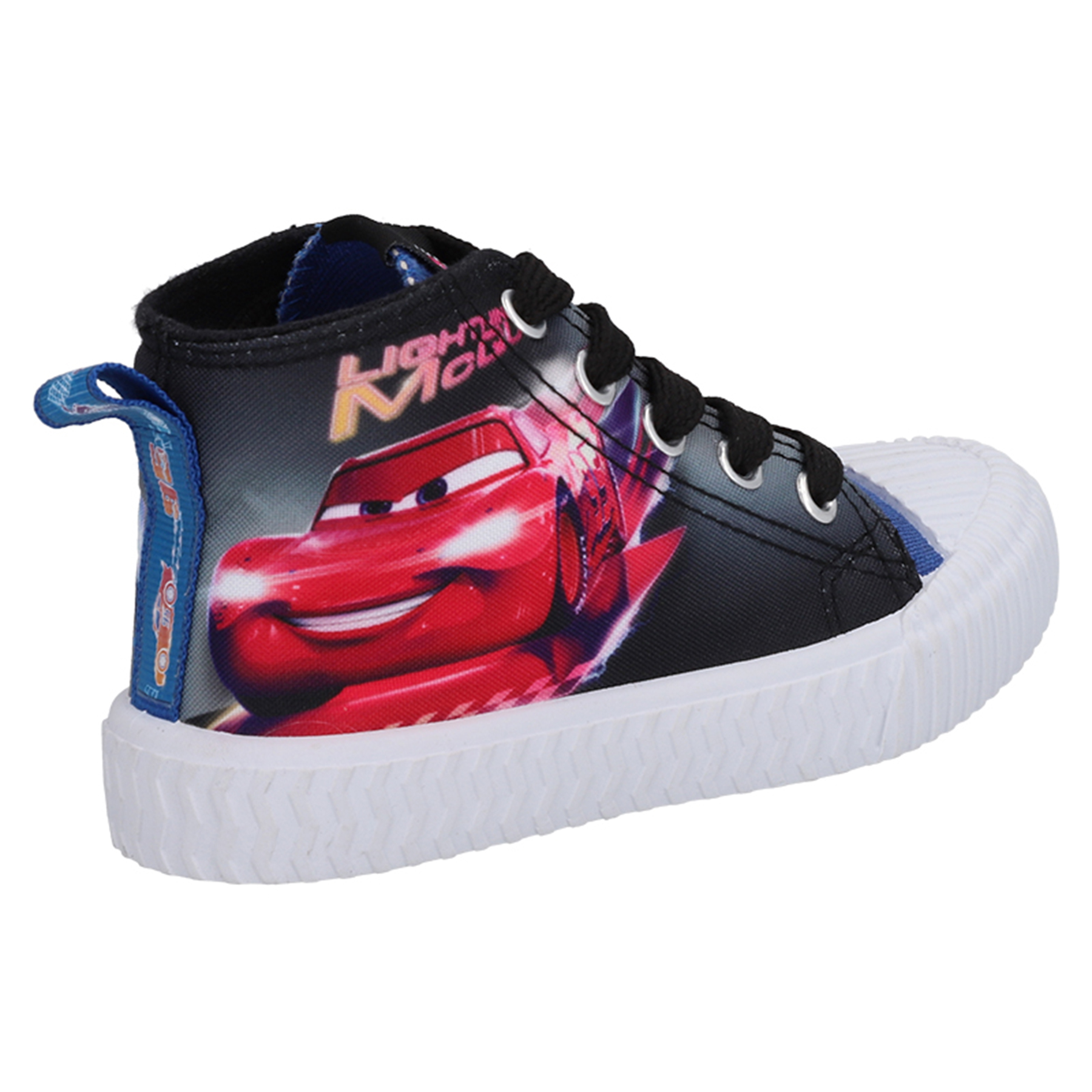 Zapatilla urbana Cars de lona caña alta, costados estampados con motivos de la película y lengüeta en denim.