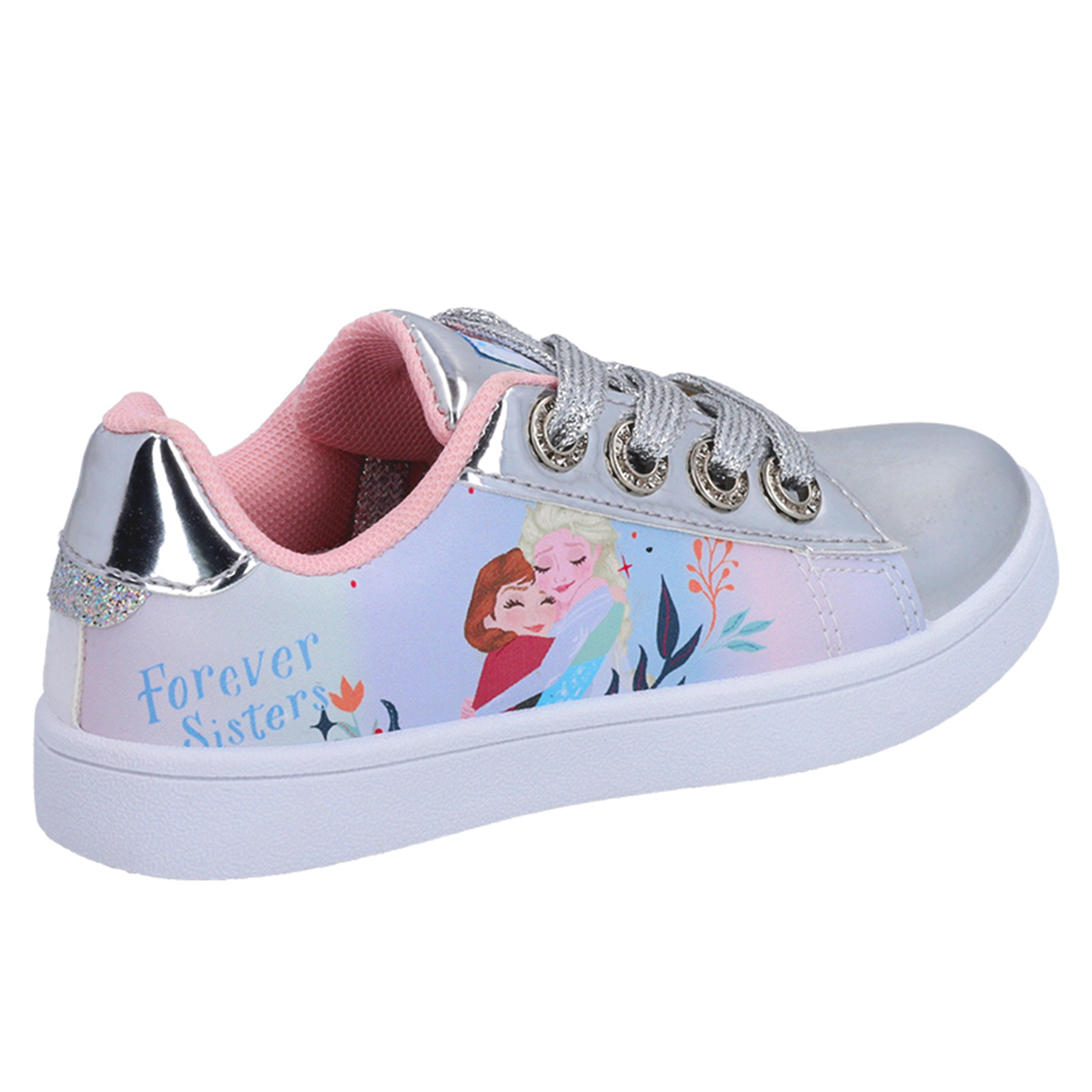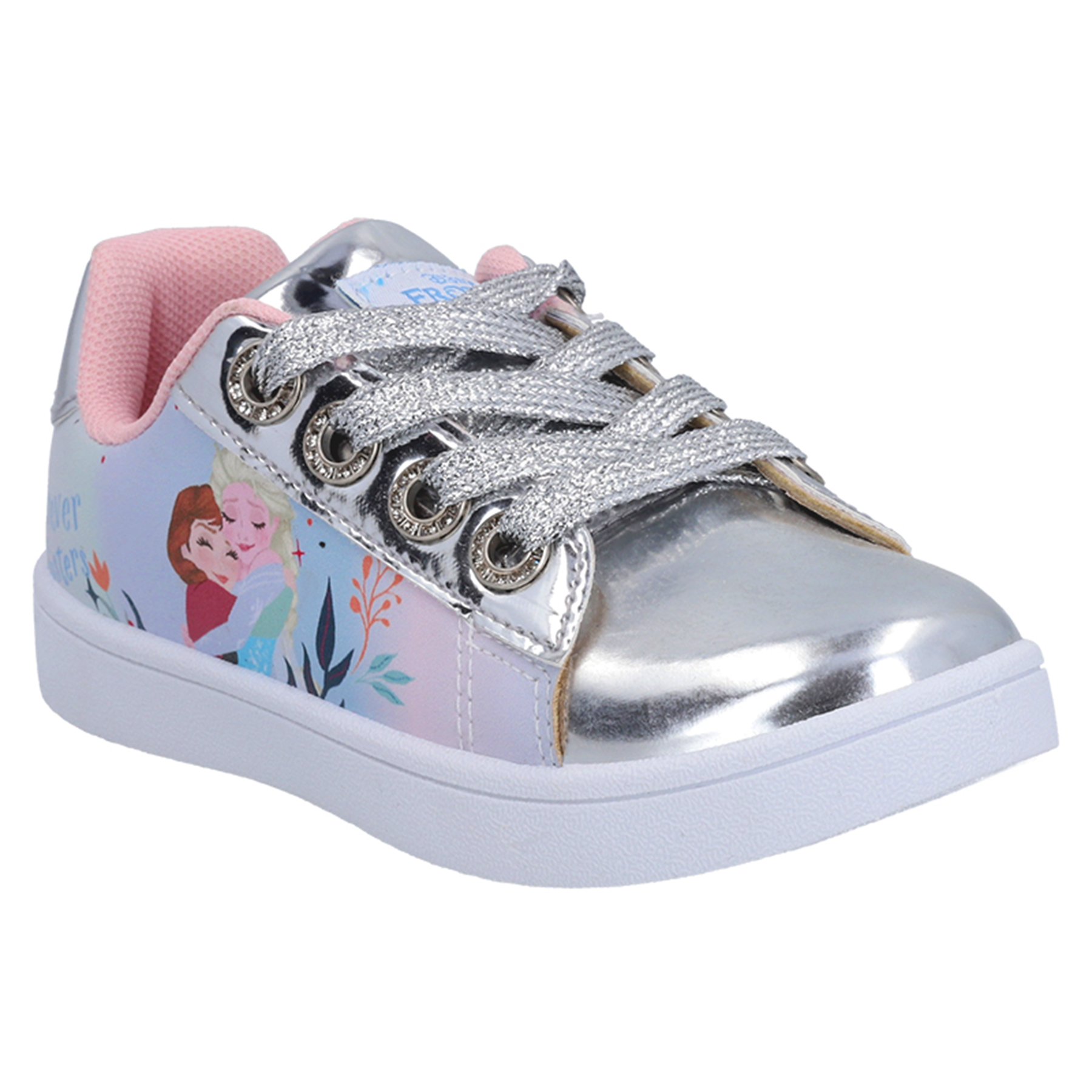 Zapatilla urbana Frozen, con puntera y lengüeta plateadas, cordones metalizados, talonera con glitter y pasa cordones con strass.