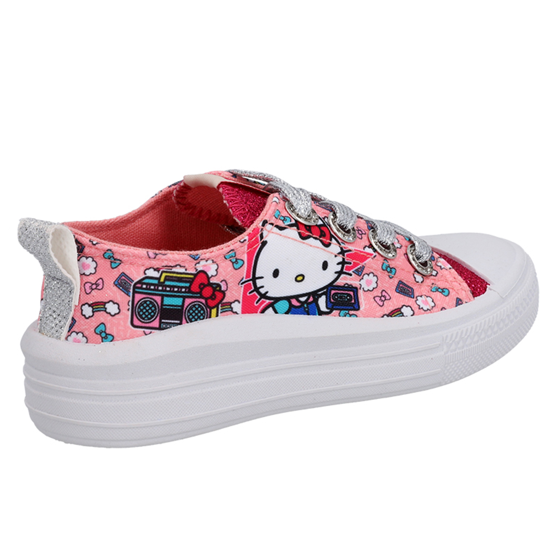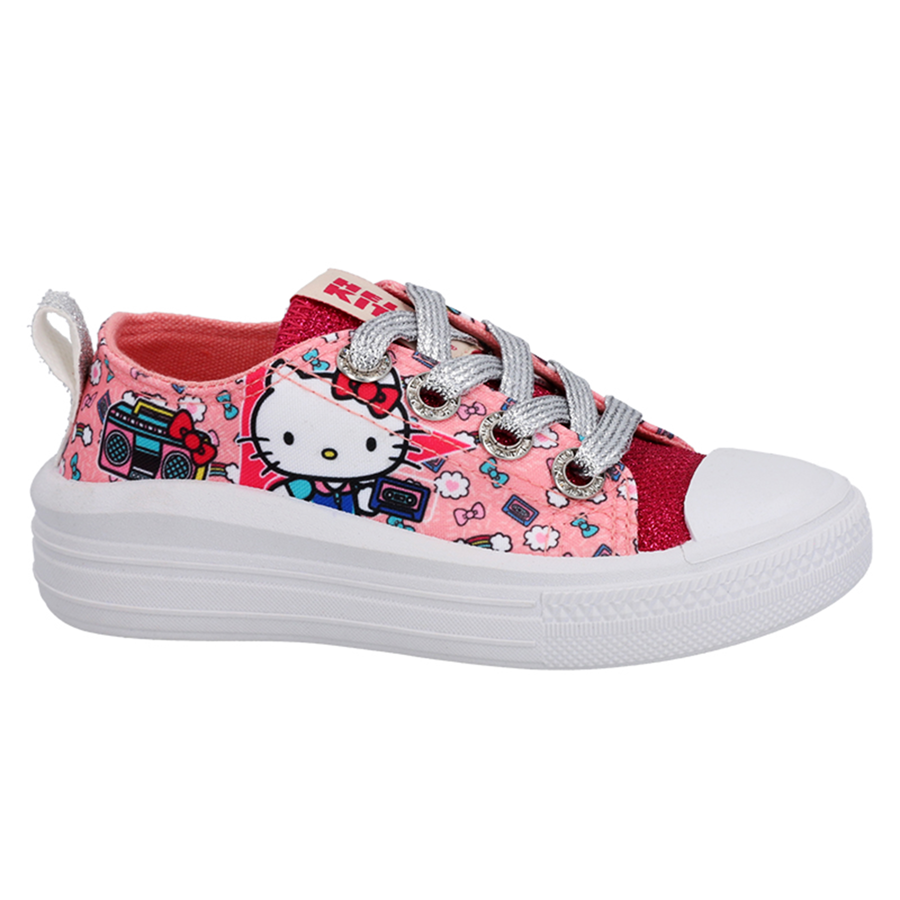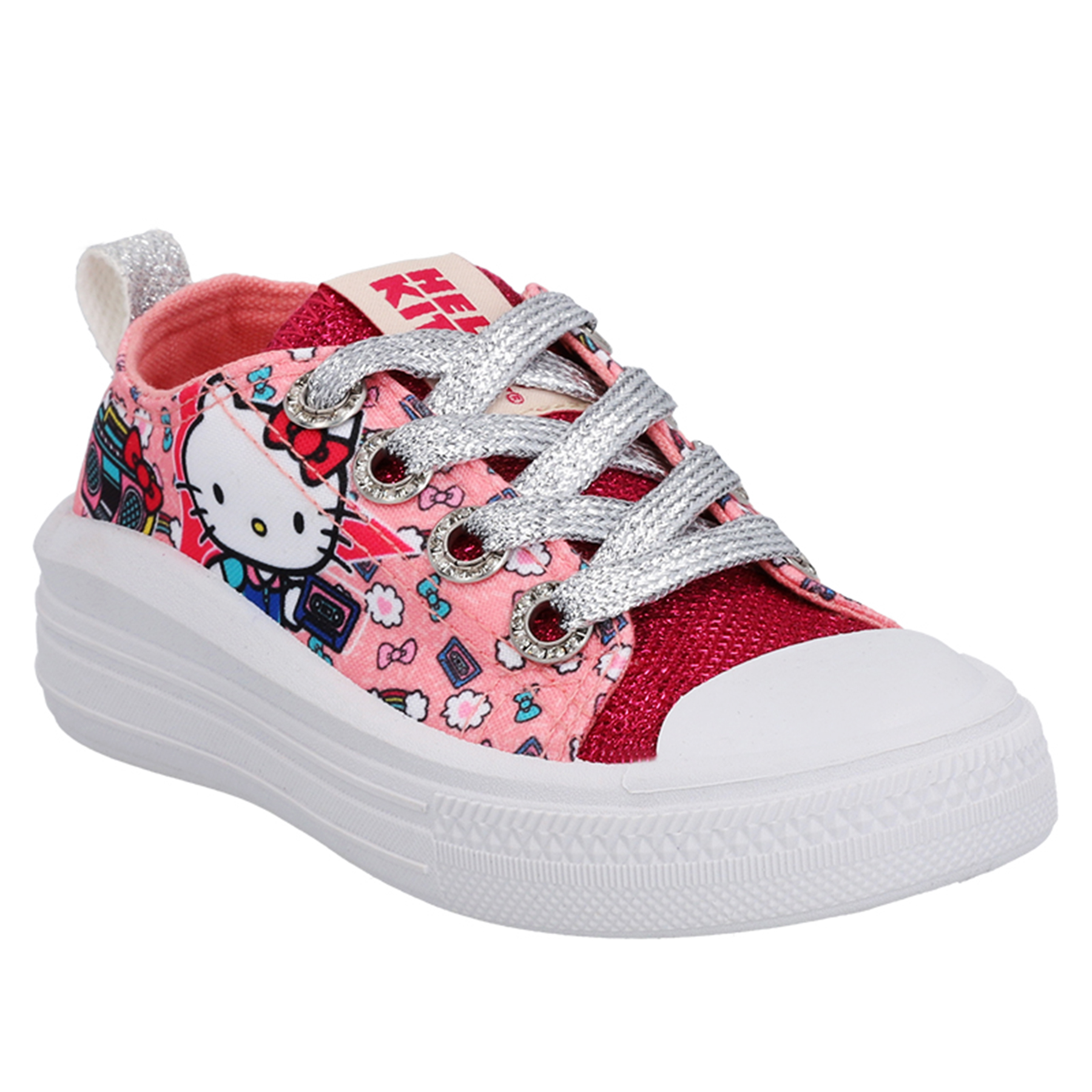 Zapatilla urbana Hello Kitty de lona, con plataforma, lengüeta con acabado metálico y pasa cordones con strass.