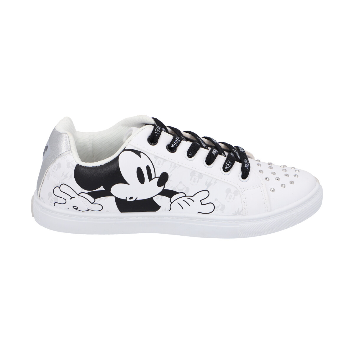 Zapatilla urbana Mickey Mouse con tachas plateadas en la puntera. Blanca, con talonera plateada y cordones personalizados.