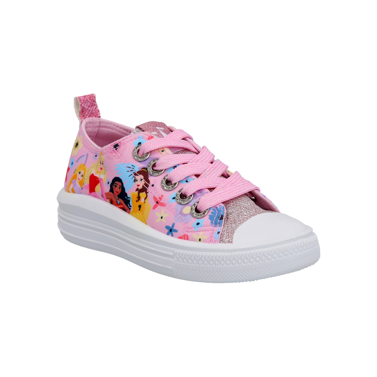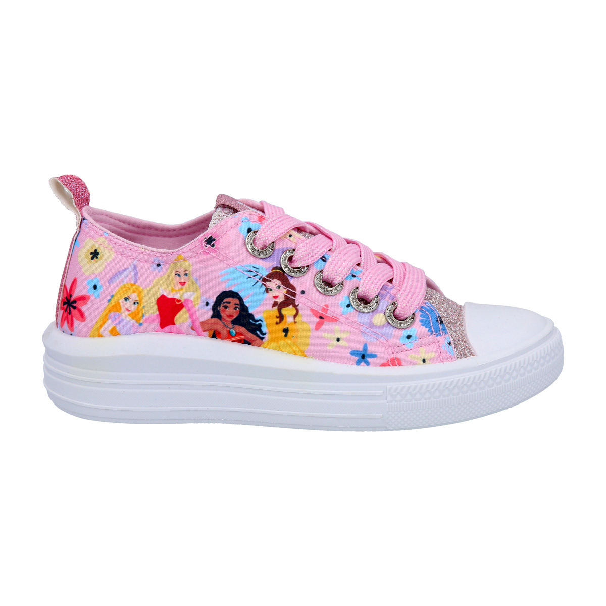 Zapatilla urbana Princesas Disney de lona con plataforma, lengüeta con acabado metálico y pasa cordones con strass.