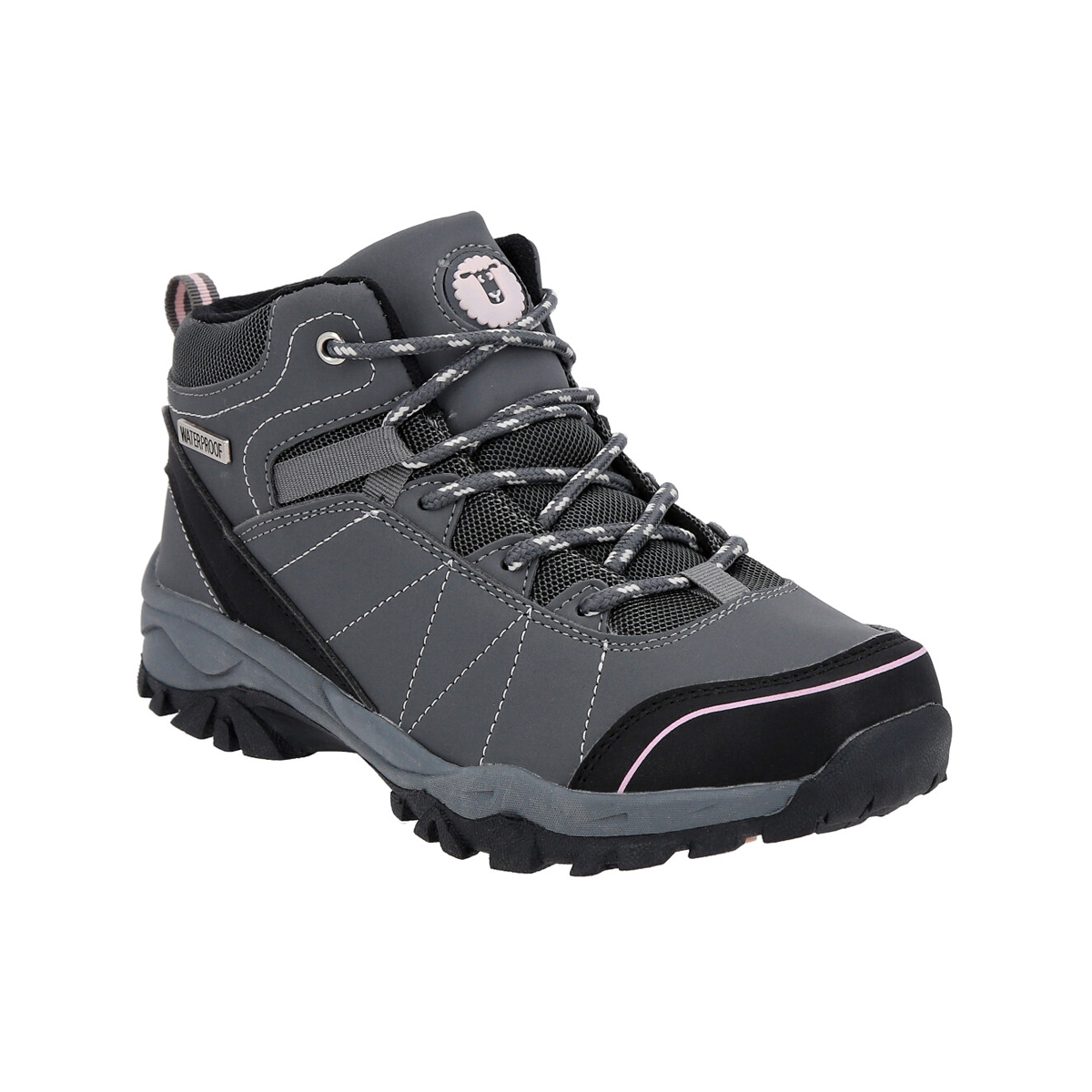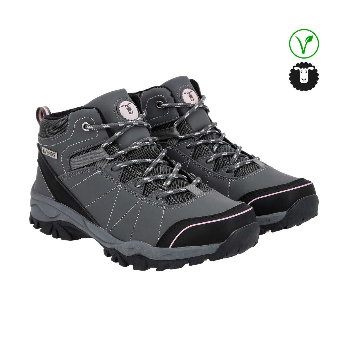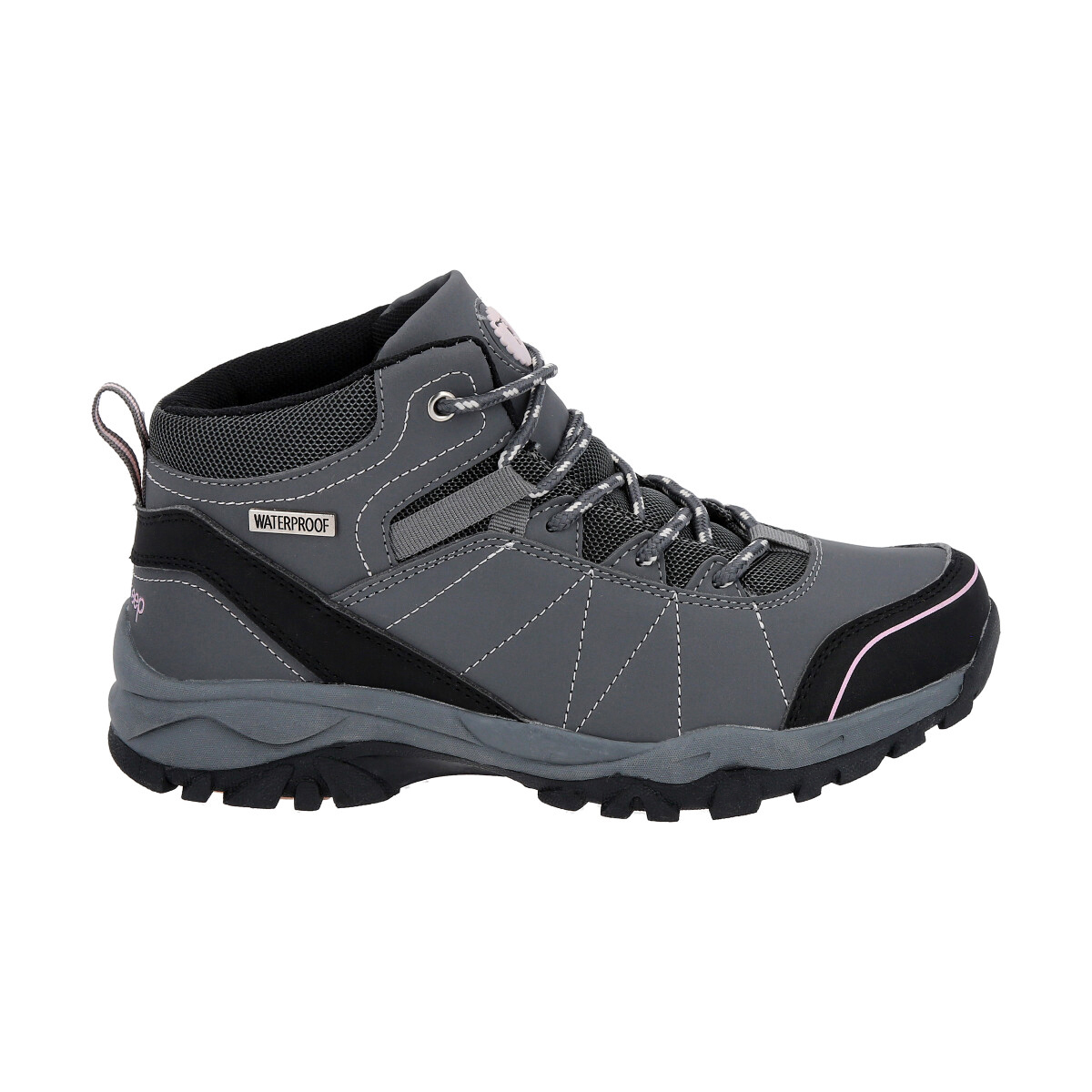 Zapato Outdoor de trekking femenino impermeable caña alta. Confeccionado con una combinación de malla multicapa de alta resistencia y cuero sintético (PU).
