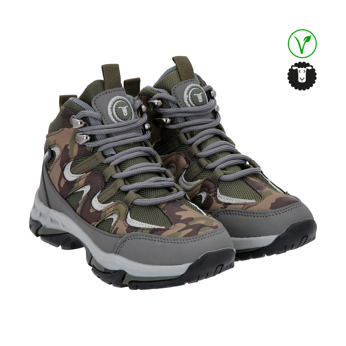 Zapato Outdoor infantil caña alta. Confeccionado con una combinación de malla multicapa de alta resistencia y cuero sintético (PU) tipo nobuck.